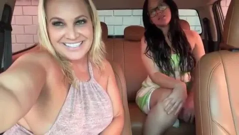 Loira praiana fazendo uma brincadeira no estacionamento com sua amiga.